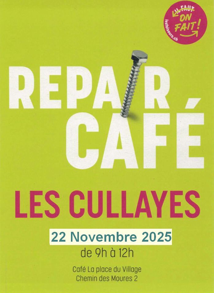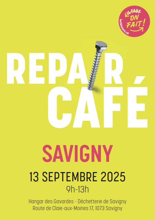 Repair Café de Savigny1er Repair Café de Savigny au Hangar des Gavardes (Déchetterie de Savigny), Rte Claie-aux-Moines 17 de 9:00 à 13:00 - Samedi 7.9.2024
